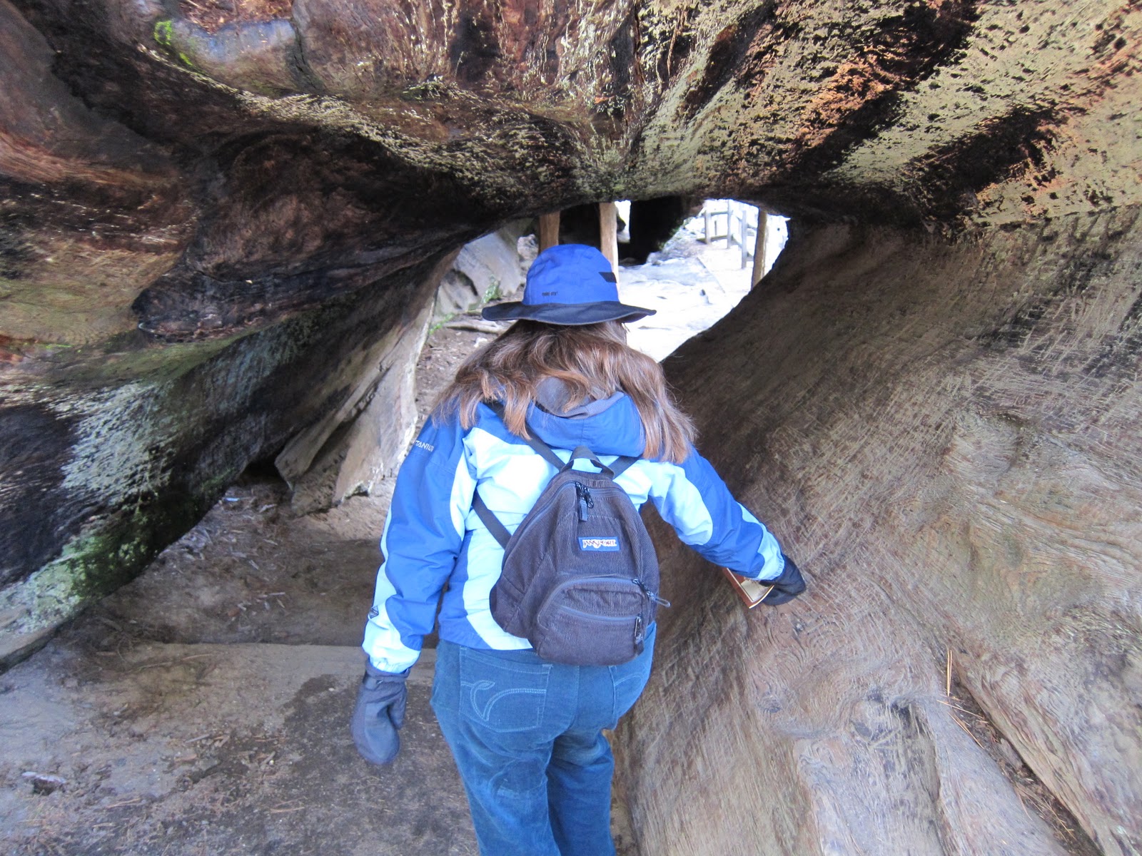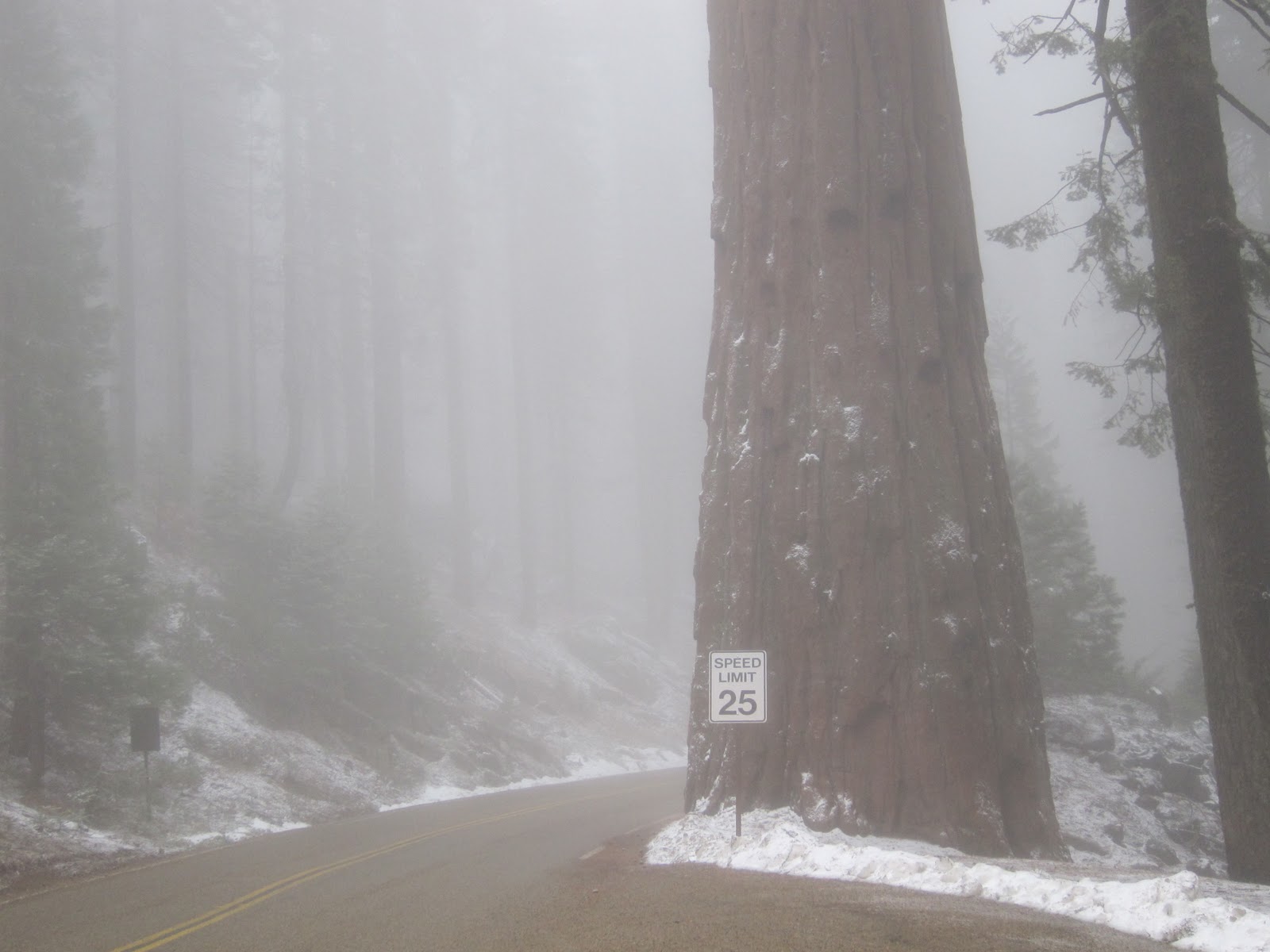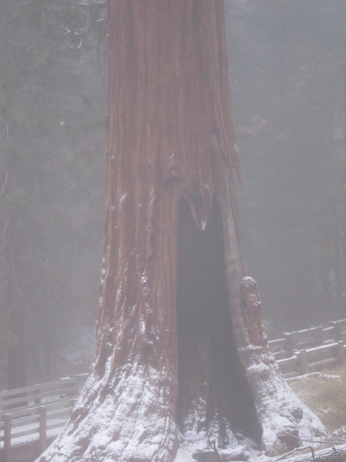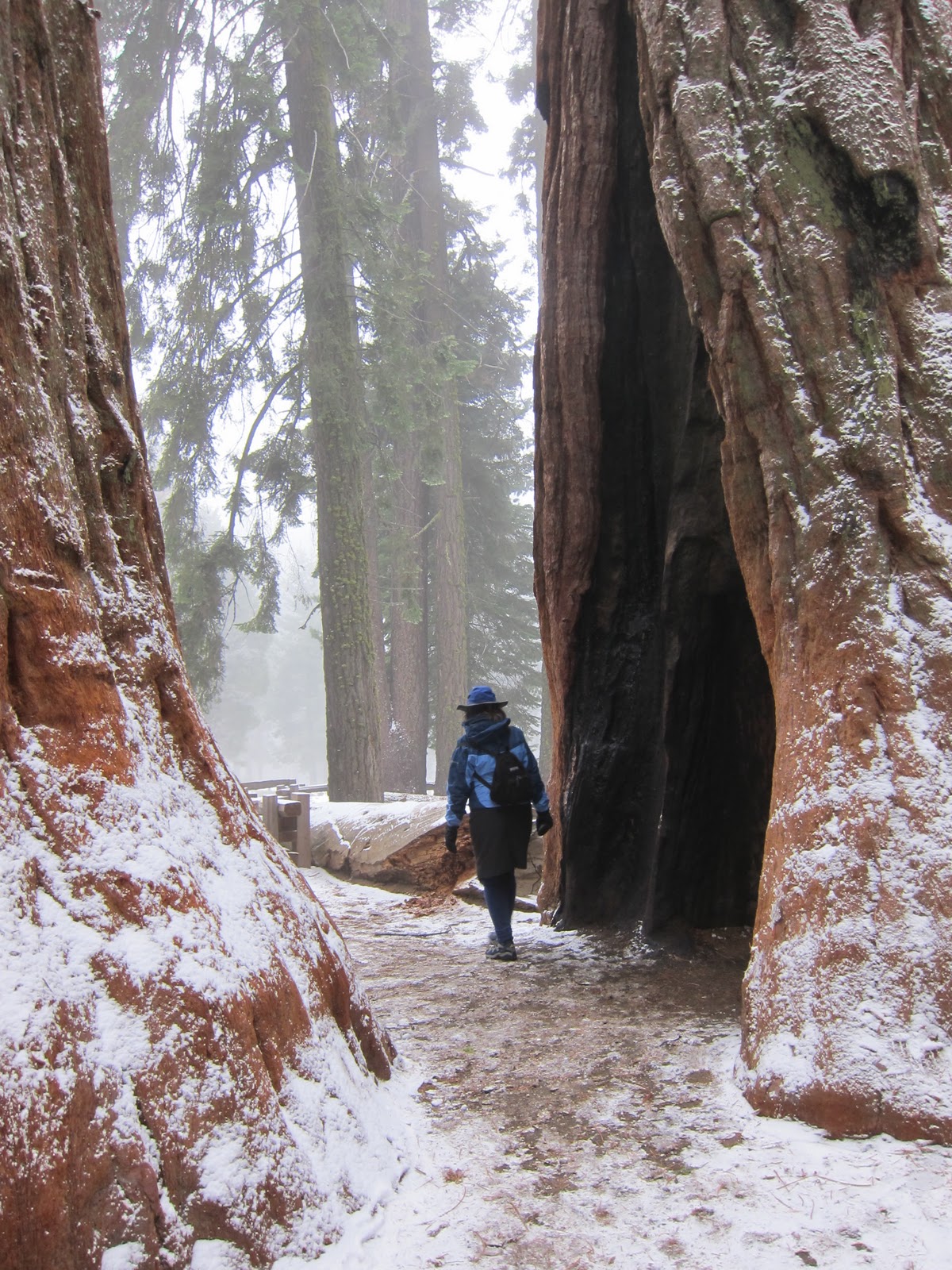 The brief disagreement didn’t ruin our happy trip, thankfully, and after a lovely warm evening reading books by the lodge fireplace, the next day we set off in a wet snowstorm to drive the short distance to SequoiaNational Park and the General Sherman tree in the GiantForest. General Sherman is THE largest living thing in the world, so we didn’t want to miss it.