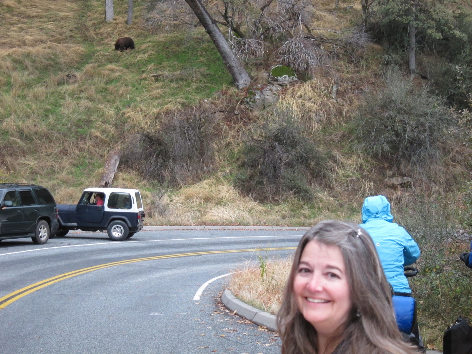 I was busy looking at the side of the road on my right, looking for pears, when Joseph saw why a lot of other people had also stopped in that spot. Bear, not pear!* The bicyclists soon joined us.