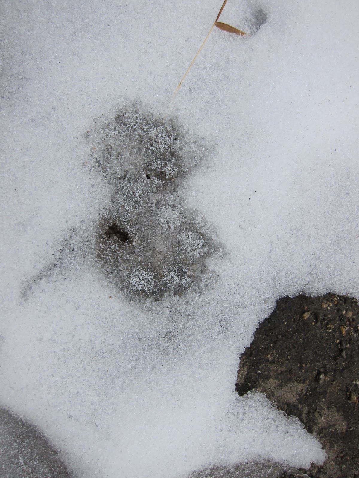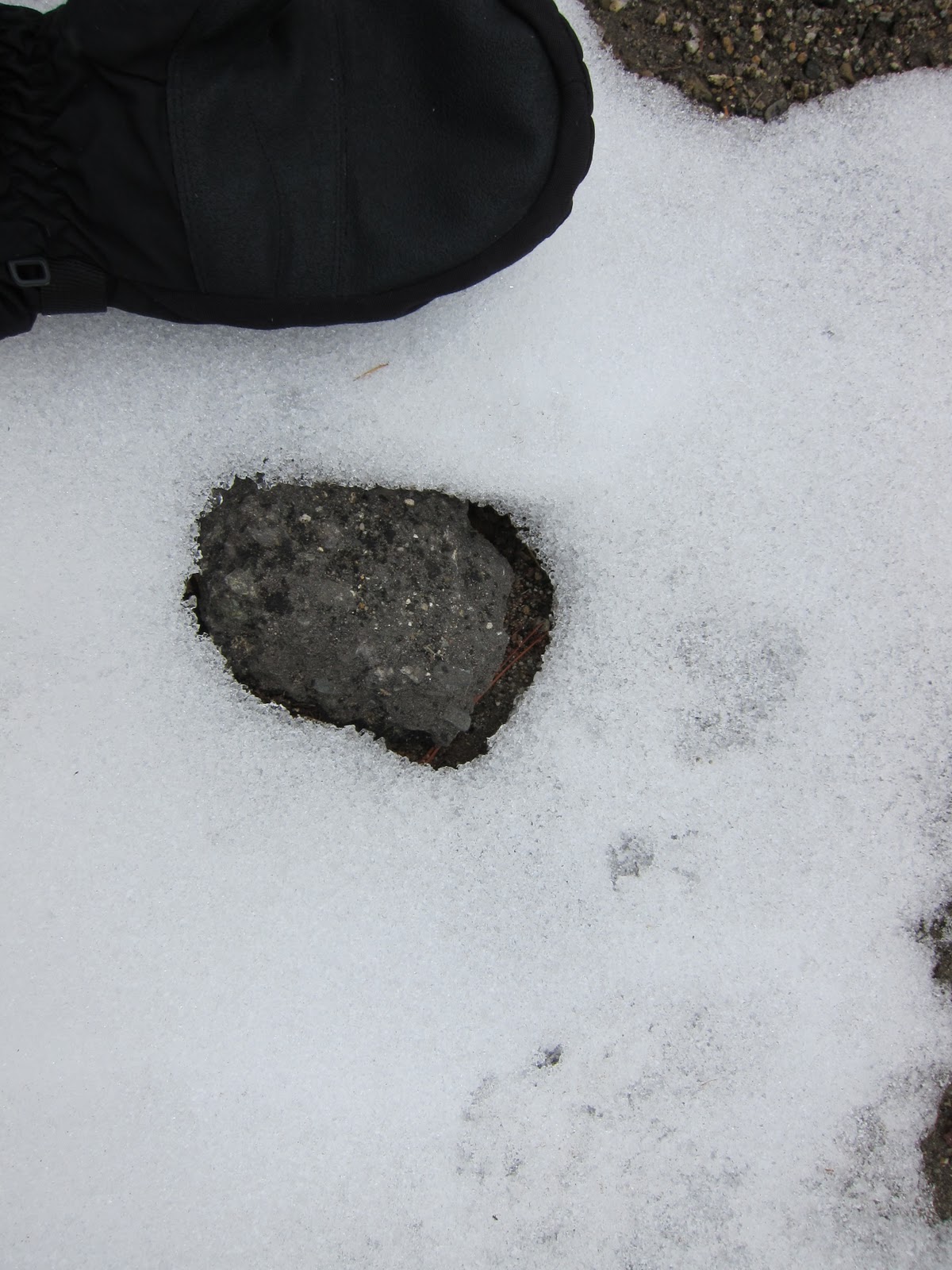 Along the way, we stopped at a lookout point. Since it was too foggy to see anything beyond the narrow roadway a hunch (or an inner prompting) sent me over to a bear-proof trash receptacle to inspect the patches of unmelted snow from the last storm. I didn’t stop to think consciously why I was doing it. But sure enough, bear prints! And that other local forest inhabitant, what I believe were cougar prints as well! (We’ll have to wait for confirmation from the tracking expert, who is busy tracking scorpions in Baja at the moment and out of computer reach.)