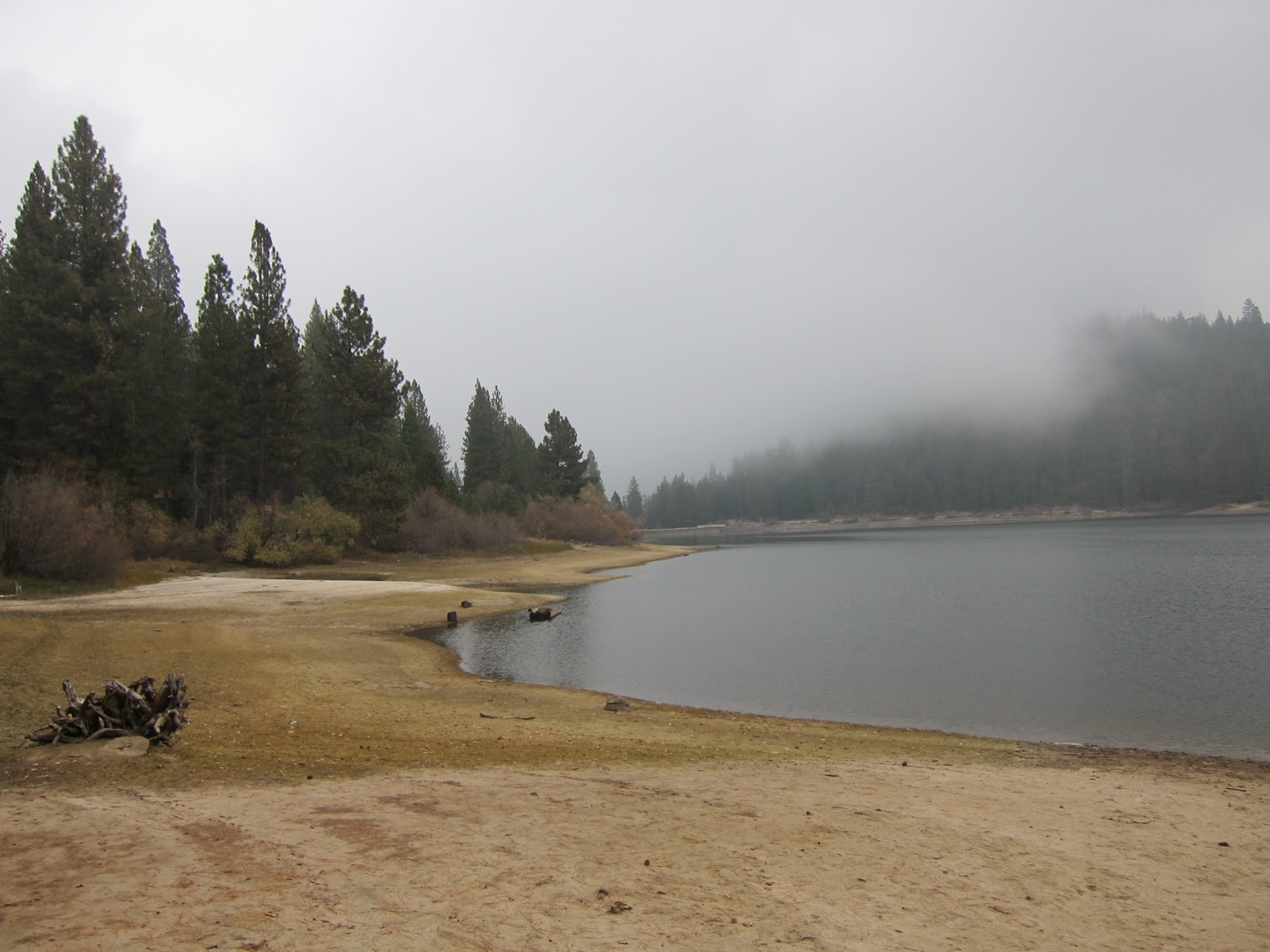 I saw not a single bear in my nervous dash from car to lodge doors, and the next morning we awoke to a spectacular woods dotted with ancient sequoias, the largest living things on earth. In the crisp November weather at 6600 feet, we appreciated every bit of warmth our good counselor (Linda Jo) had taught us to wear: neck gaiters and waterproof brimmed hats, Smartwool socks, waterproof foot gear. It didn’t rain or snow the first day as predicted, but the dense fog rolled in, obscuring trees late in the afternoon. And the next day, when it did snow despite predictions that it wouldn’t, we were amply dressed, dry, and comfortable.
