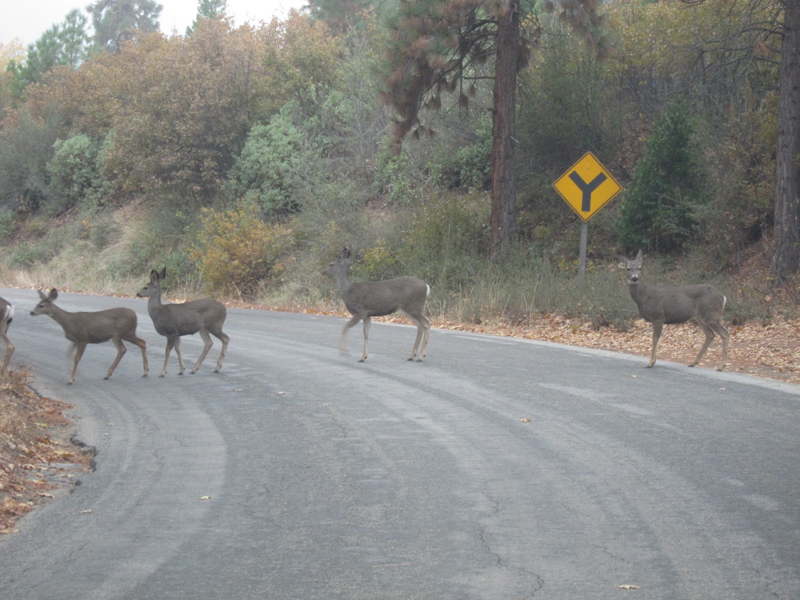 But by the time we drove to HumeLake (our consolation for not being able to walk the trail), my fears came back full force. After a long twisty drive in the rapidly falling dusk, we twirled around a narrow switchback and Joseph came to a sudden stop. Six mule deer moseyed across the road, posing as does are wont to do while he took pictures, taking their time on their way to the lake.