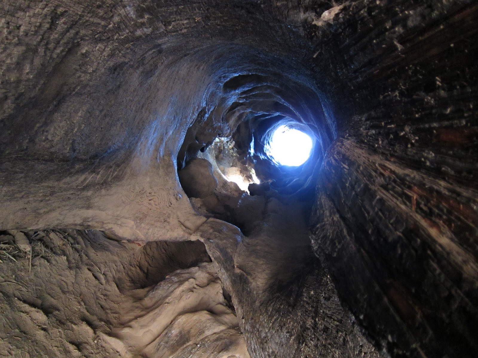 Nearby, we took pictures of the Vermont log. Can you believe the roots of these giants are no more than five feet deep? They survive many forest fires, and then, since the uphill sides collect the most brush, burn more on those sides, weaking that side of the tree over the years. When they crash, they plummet to the forest floor uphill! This tree was 246 feet tall, sixteen feet in diameter before it fell uphill in 1985. We could only see the bottom section; the rest was lying up over the rise.
